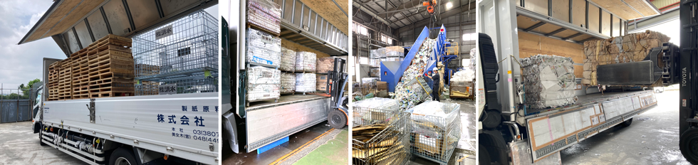 回収された古紙は、選別・荷造り(圧縮・結束)して倉庫で保管し、必要に応じて国内外の製紙メーカーへ大型トラックやトレーラーで輸送します。製紙メーカーへの製紙原材料の安定供給の一端を担っています。