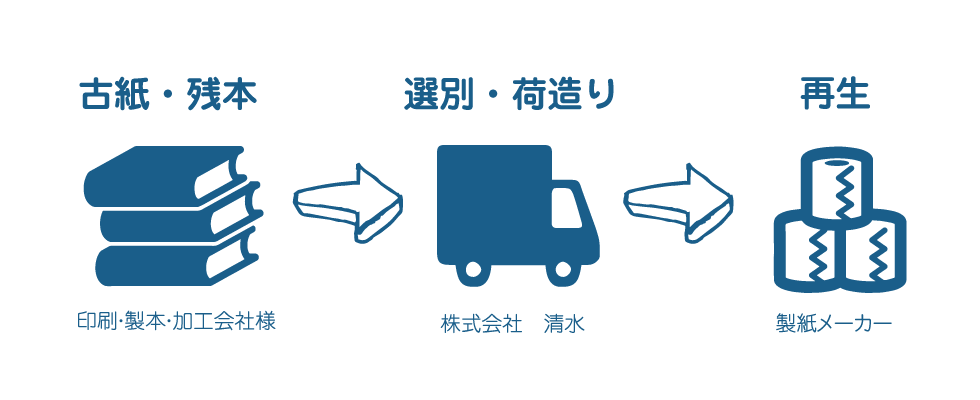 製紙メーカーで古紙を溶かし異物を除去・もみほぐし、古紙パルプとなります。また古紙パルプは板紙加工、ロール状に巻き取り製紙原料となります。そうして、さまざまな古紙製品に再生されます。